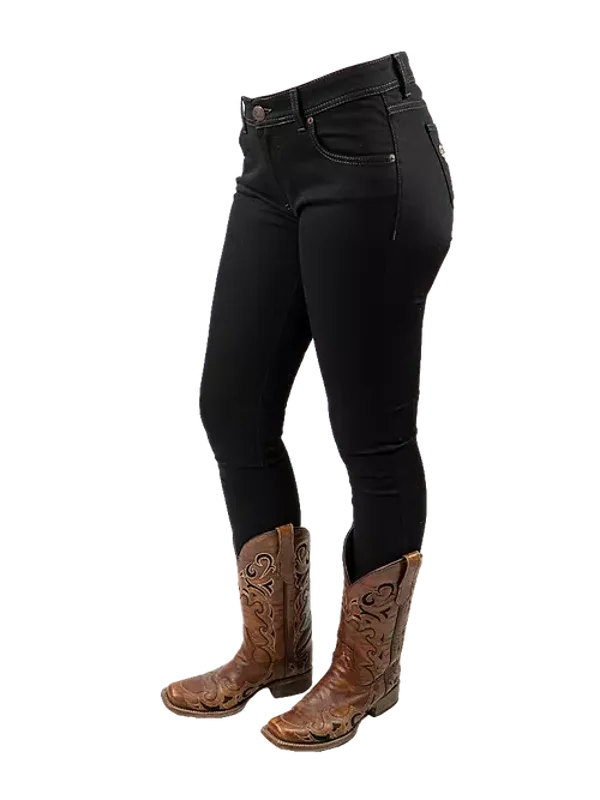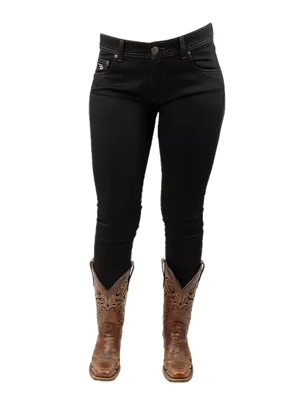 Het materiaal bestaat uit slijtvast materiaal met 5% elastomultiester dat lang zijn vorm en kleur behoudt. De jeans behoudt zijn pasvorm tijdens het werken of rijden en wijdt alleen comfortabel en niet te veel. Ze is smal bij de knie en been. Het zit comfortabel hoog, iets boven de heupbeenderen. Op de achterzakken is het Ranch Girls Icon logo geborduurd.