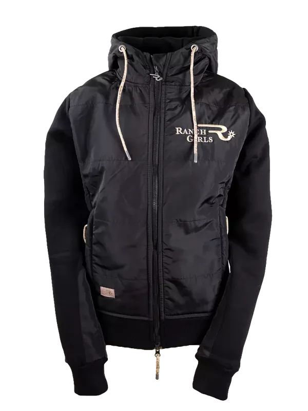 Het onverslaanbare Ranch Girls Sweatshirt Pro Shield 'CARRY' zwart is gearriveerd. De ultieme combinatie van 3-draads sweatshirtkwaliteit en nylon. Het nylon materiaal - op de voorkant van het lichaam, op de capuchon en over de schouderbladen - houdt wind en regen buiten. De warme sweatshirtkwaliteit zorgt voor bewegingsvrijheid en vochtafvoer. Een geweldig artikel dat je door alle seizoenen zal vergezellen. Het fijne borduurwerk van het Ranch Girls-logo kenmerkt een bijzonder merkartikel.