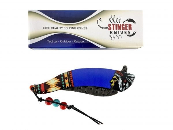 8.5" Knife with Aztec pattern handle and dotted design on 3" blade. Knife has leather and bead accent