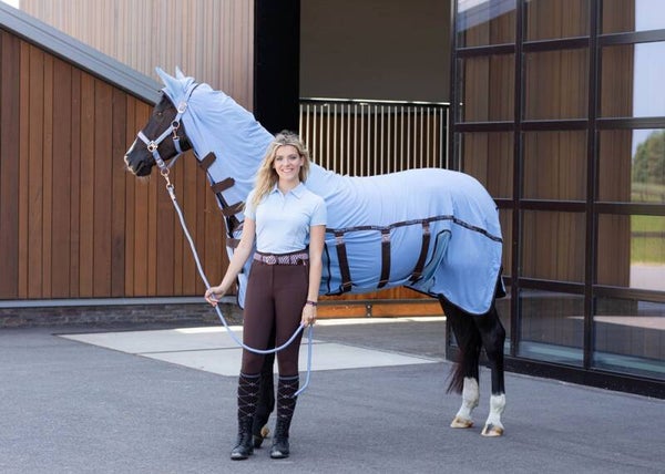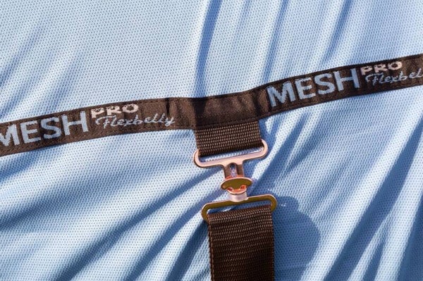 Mesh Pro deken, te gebruiken als vliegendeken of coolerdeken. De deken is voorzien van een dubbele voorsluiting, vaste hals met drie sluitingen en een voering om de manen te beschermen, buiksingel, extra brede staartflap en staartlus. De borst is met polyester gevoerd.