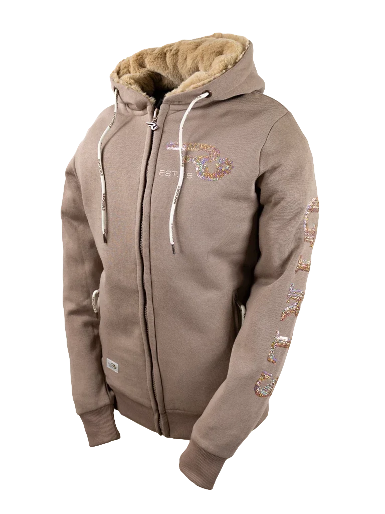 The Ranch Girls Teddy Sweatshirt Jacket 'SCARLETT'softsand, is a super warm hooded jacket lined with cozy teddy fur. It has a straight, comfortable long cut, the sleeves are cut slightly longer, perfect for all riding activities. Our favorite western riding item has high-quality sequin designs on the chest and arms. The item runs true to size, rather half a size larger, so runs generously.