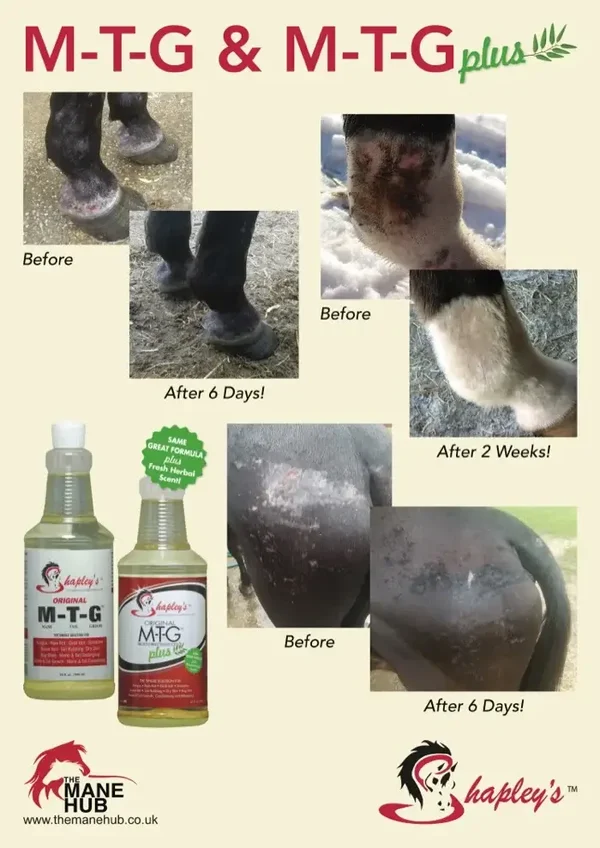 Originel MTG, ontwikkeld door een kapper in 1938 om menselijke huidaandoeningen te behandelen, heeft zichzelf bewezen als wonderbaarlijk voor huidproblemen bij paarden. Originel MTG is getest en bewezen. Het wordt door de dierenarts aanbevolen als de oplossing die nodig is voor een verscheidenheid aan bacteriële en schimmel huidproblemen.