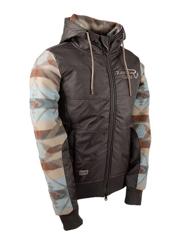De Ranch Girls Polar Fleece Pro-Shield Jacket 'CHARLEE' woestijnijs/modder, in nieuw Azteken/zuidwest patroon. De nylon rand is op het zachte fleece gewatteerd en houdt je beschermd tegen water en wind. Ook de capuchon is gemaakt van hetzelfde, stille nylon. De outdoorjas heeft grote steekzakken met YKK-ritsen, de hoofdrits is dubbel waardoor je de jas ook van onderaf kunt openen. Dit is bijzonder praktisch tijdens het rijden, omdat u zich indien nodig snel van onderaf kunt bevrijden, bijvoorbeeld als u vast komt te zitten aan de westernzadelhoorn. De duurzame en toch zachte nylon bekleding is ook aan de onderarm bevestigd. Deze ruimte wordt vaak gebruikt bij het verzorgen van paarden. Zachte ripsmanchetten aan de zomen voelen comfortabel aan en zijn elastisch. Deze westernjas in rijstijl heeft een langere snit waardoor er ruimte is voor een shirt met lange mouwen of lichte kleding eronder. De mouwen zijn ook lang gesneden. Het is niet nodig om de jas groter te bestellen, tenzij je hem bewust een maat groter wilt dragen.