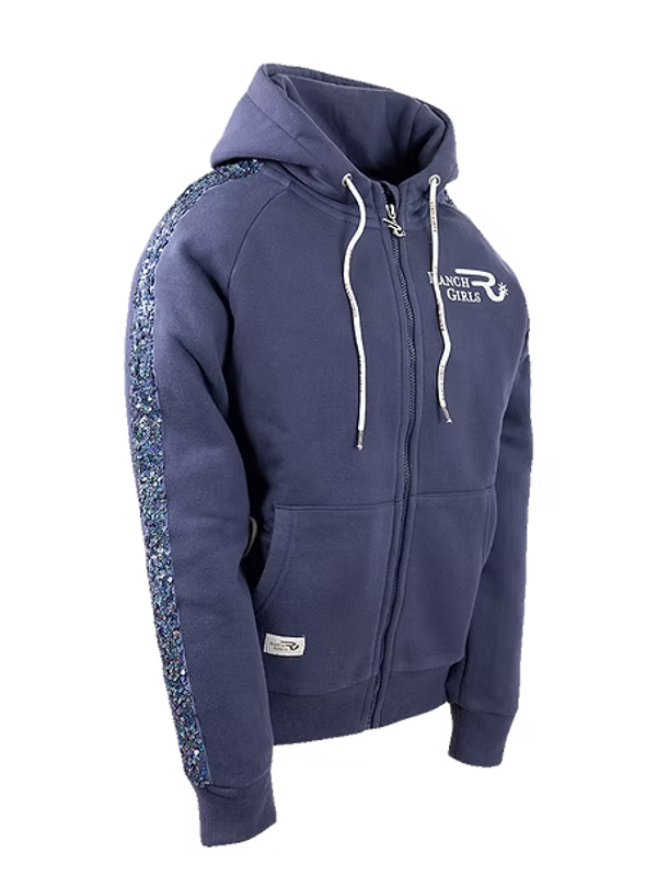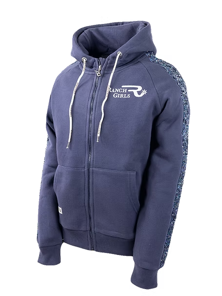 Ranch Girls Hooded Sweat Jacket 'JAZZ' in Odyssey Grey – een populair revival-ontwerp met een elegante paillettenstreep over het midden van de mouw. Opvallend, modieus en gegarandeerd een blikvanger. Gemaakt van onze hoogwaardige sweatshirtstof, de beproefde driedraadsstof met een zacht geborstelde binnenkant, biedt het jack een comfortabele pasvorm. De snit zorgt voor optimale bewegingsvrijheid en een perfecte pasvorm – de mouwlengte is speciaal afgestemd op westernrijders. Een klein ritszakje onder de kangoeroezak biedt ruimte voor belangrijke spullen, zoals autosleutels, en houdt ze veilig opgeborgen, zelfs tijdens het rijden.