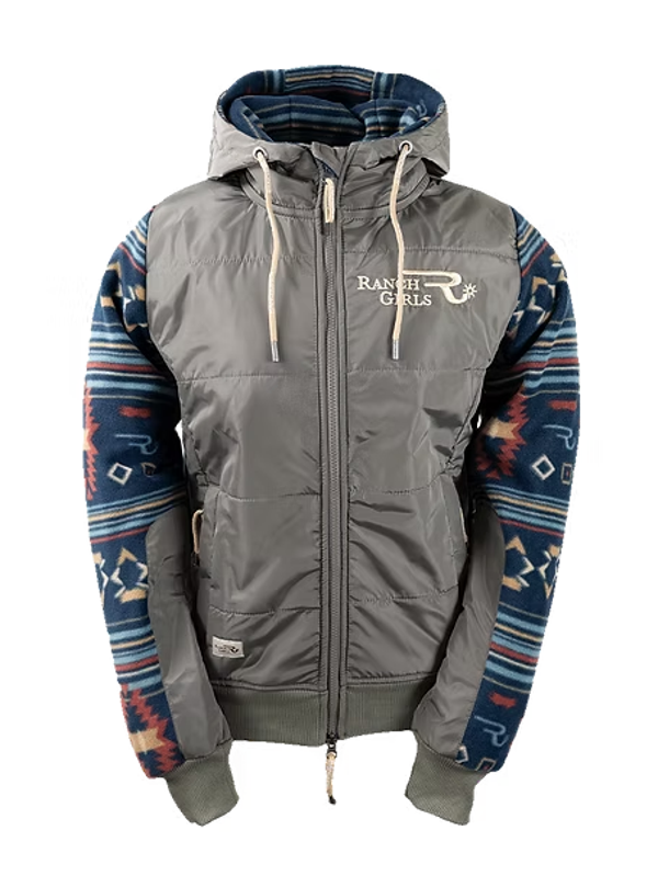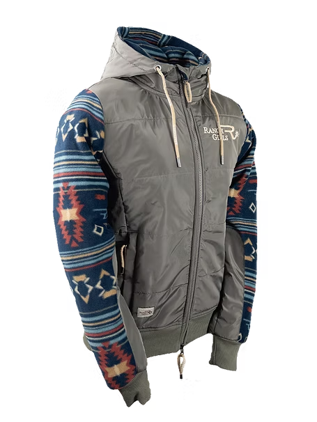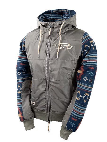 The Ranch Girls Polar Fleece Pro-Shield Jacket 'CHARLEE', in a new Aztec / south-west pattern. The nylon trim is quilted onto the soft fleece and keeps you protected from water and wind. The hood is also trimmed with the same soft nylon. The outdoor jacket has large pockets with YKK zippers, the main zipper is a double way, so you can also open the jacket from the bottom. This is particularly practical when riding, as you can quickly free yourself from underneath if necessary, for example if you get caught on a western saddle horn. The hard-wearing yet soft nylon trim is also attached to the forearm. This area is often stressed when grooming horses. Soft rip cuffs at the hems feel comfortable and are elastic. This western riding style jacket has a longer cut that allows room for a long sleeve shirt or light clothing underneath. The sleeves are also cut long. It is not necessary to order the jacket larger, unless you want to wear it one size larger on purpose.