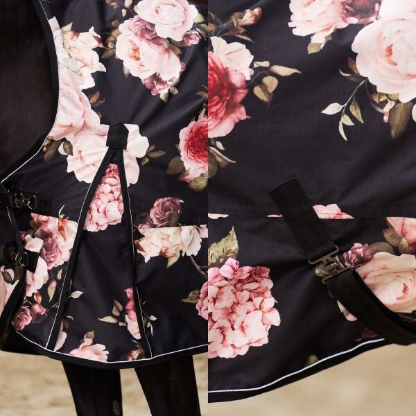 unctional outdoor blanket in an attractive design. The light and robust outdoor blanket offers your horse protection from cold, humidity, and insect - and it looks great all the while! Secure support and great wearing comfort are a guarantee with this withers cushion, 3-way adjustable double chest fastening with carabiner-style clasp, leg straps, a reinforced kick pleat, and the protective tail rubber strip. In visual terms, this item leaves nothing to be desired thanks to its beautiful hand designed print and color. Warm, dry, comfortable, and stylish - a high-quality all-round item!