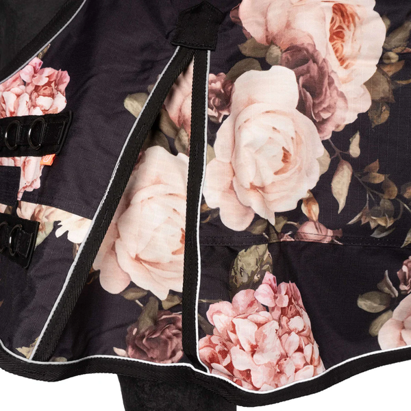 Functional outdoor blanket in an attractive design. The light and robust outdoor blanket offers your horse protection from cold, humidity, and insect - and it looks great all the while! Secure support and great wearing comfort are a guarantee with this withers cushion, 3-way adjustable double chest fastening with carabiner-style clasp, leg straps, a reinforced kick pleat, and the protective tail rubber strip. In visual terms, this item leaves nothing to be desired thanks to its beautiful hand designed print and color. Warm, dry, comfortable, and stylish - a high-quality all-round item!