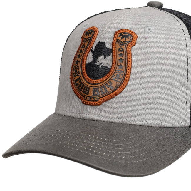 Met een antracietgrijs voorpaneel en klep en een zwart mesh achterpaneel biedt deze pet ademend vermogen en duurzaamheid voor elke gelegenheid. De zwarte leren patch aan de voorkant toont de tekst "Cowboy Wild Rodeo" met een opvallend 3D-embleem van een bronc rider, wat een vleugje westernstijl toevoegt.