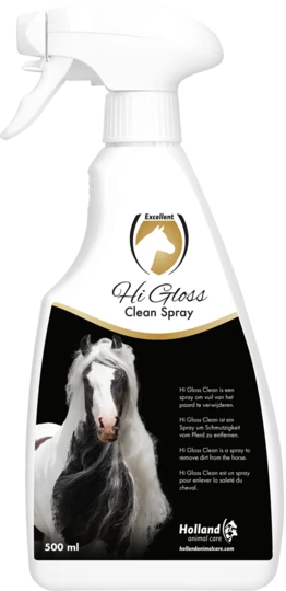 Hi Gloss Clean is een spray om vuil van het paard te verwijderen. Hi Gloss Clean Spray is ideaal in het najaar en in de wintermaanden (nu hoef je je paard met langere haren niet meer te wassen).
