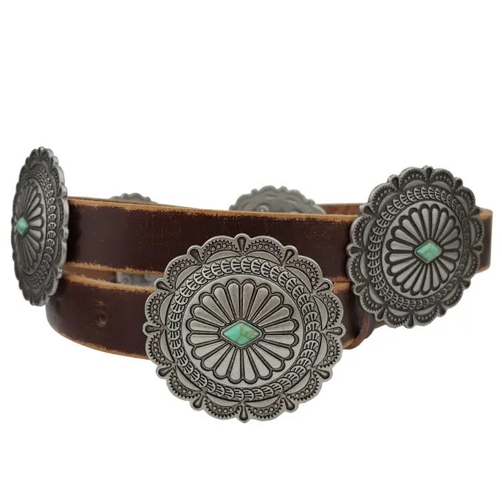 5 verschuifbare concho's met stenen op de riem plus een bijpassende gesp, in totaal 6 delen per riem